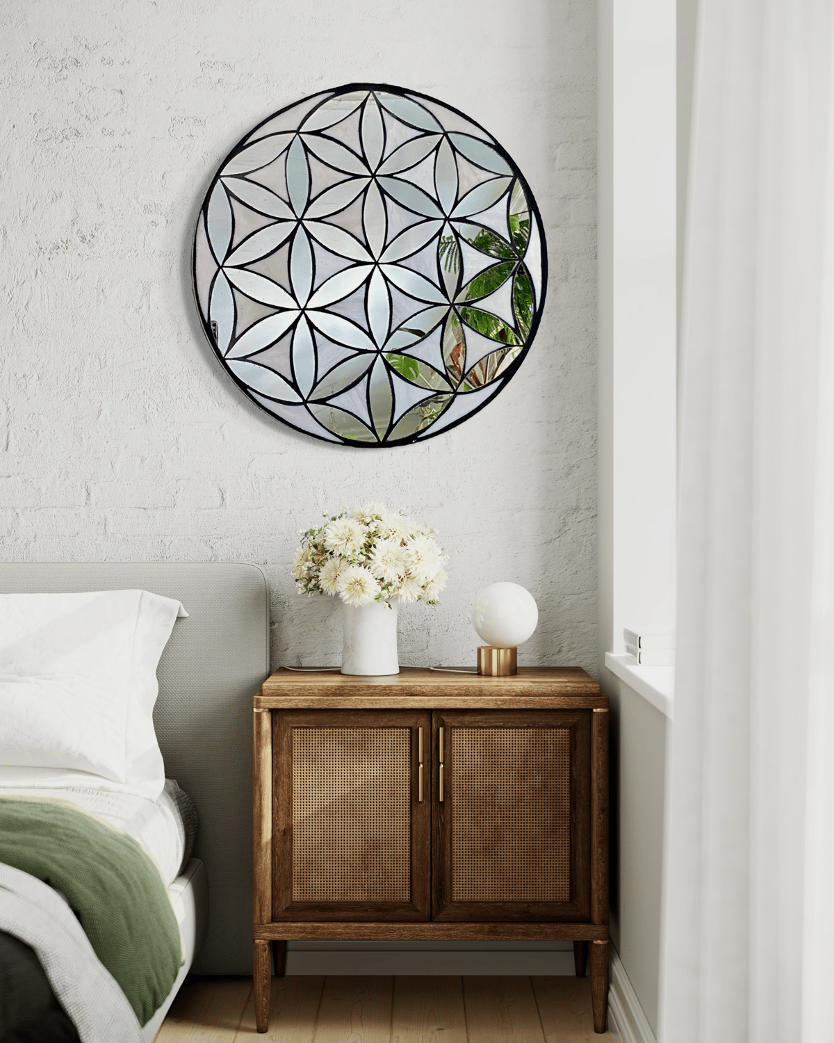 This exquisite Flower of Life mirror mosaic is elegantly framed with a whisky barrel belt, creating a unique and rustic aesthetic. Designed to be placed in areas that encourage calmness, balance, and serenity, the Flower of Life symbolizes the ancient sacred geometry that reflects the interconnectedness of all living things. With a diameter of 24 inches and a weight of 9.5 pounds, this piece serves as both a striking decorative element and a meaningful representation of harmony in life.